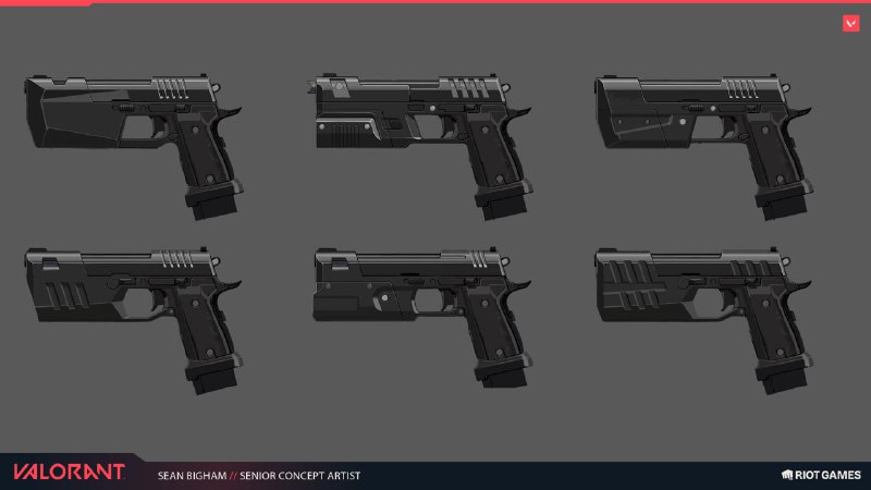 В публикации показаны различные стадии разработки: грубые наброски, вариации форм и цветовые тесты для оружия и аксессуаров. Шон Бигхэм поделился как концептами отдельных пистолетов (Bandit), так и альтернативной интерпретацией Outlaw и прототипной «базукой» для Рейз, которые демонстрируют поиски формы и функционала.